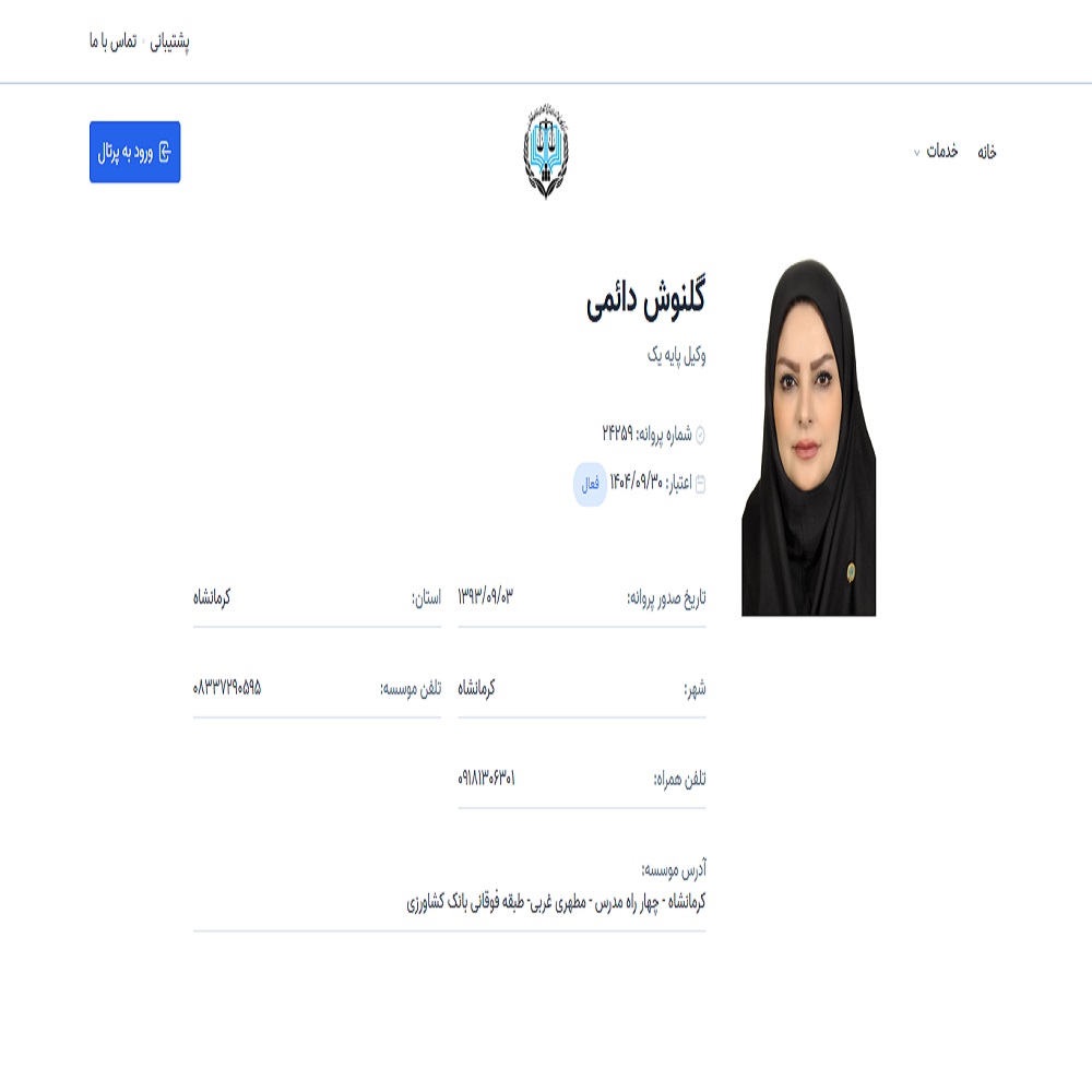 کرمانشاه، چهارراه دادگستری، بلوار بنت الهدی، مجتمع وکلای ارشاد، طبقه همکف